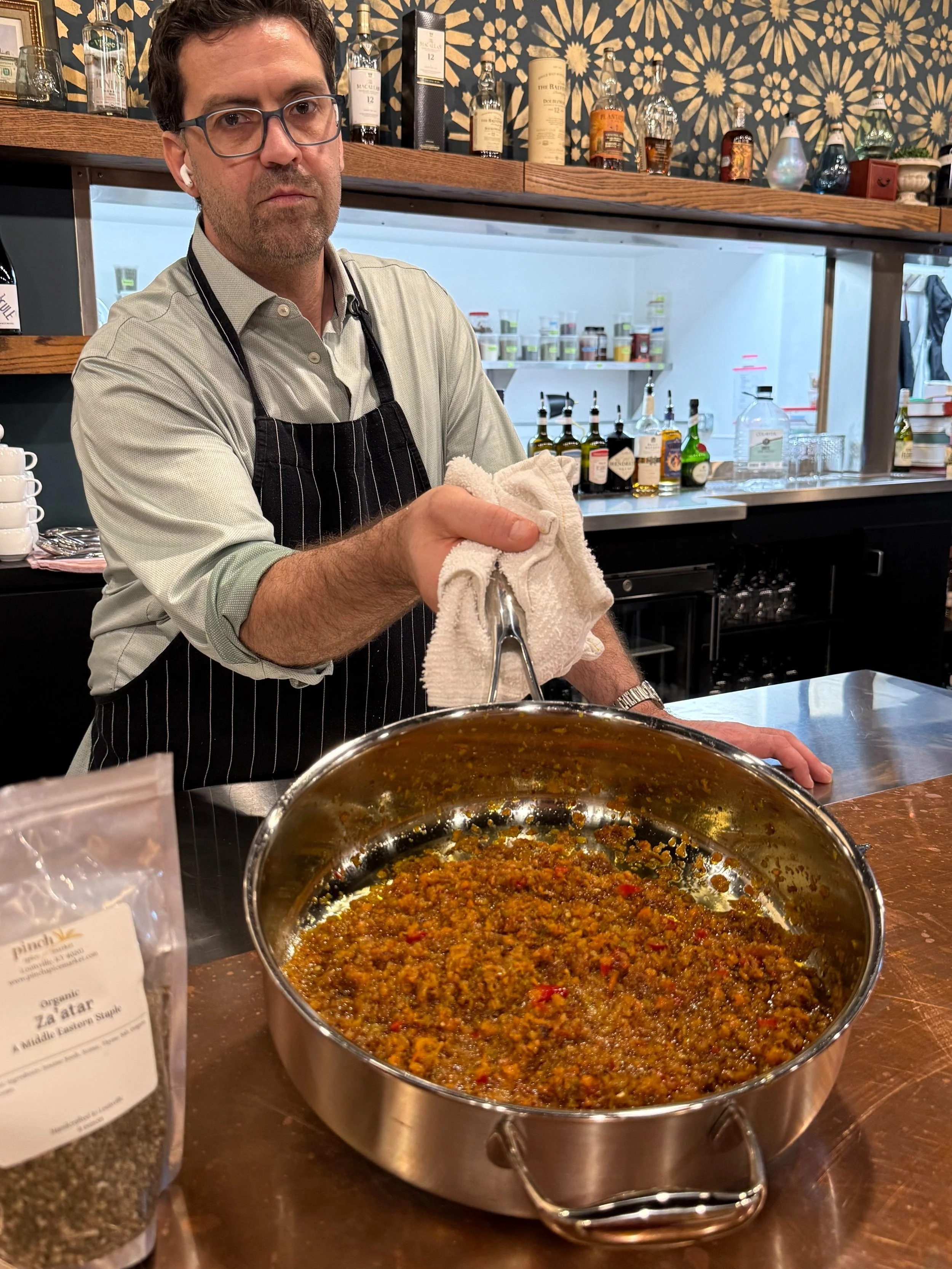 Increase to medium heat. Add the za’atar spice blend and chiles, stirring to bloom the flavors—about 1.5 minutes.